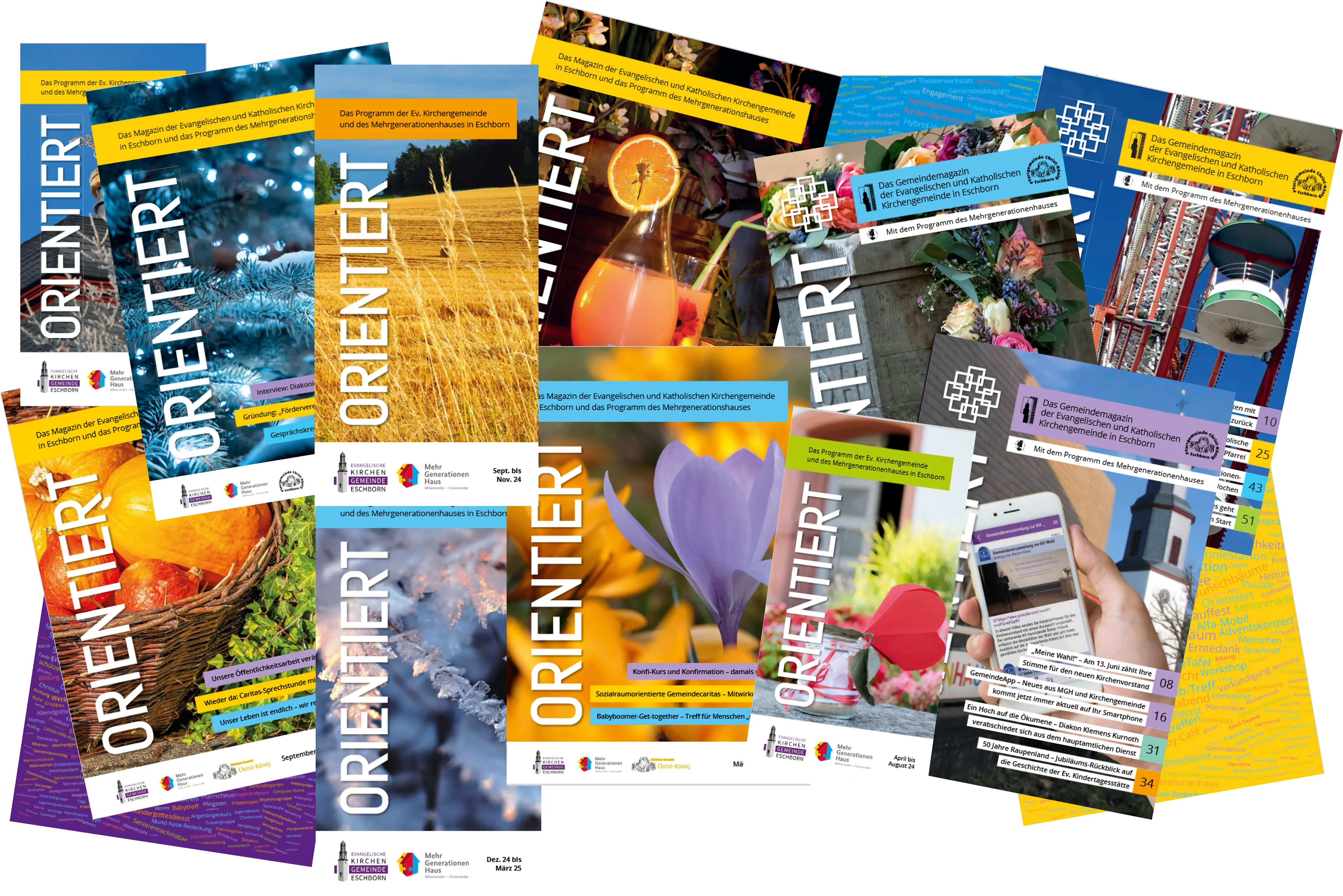 Das Gemeindemagazin "Orientiert" wurde im Dezember 2023 das letzte Mal an alle Haushalte im Bereich unserer Kirchengemeinde in Eschborn verteilt. Danach, also seit Palmsonntag 2024 liegt es drei Mal im Jahr dem Stadtspiegel bei und ist abholbereit im Gemeindebüro in der Hauptstraße 18 und am Schaukasten am Gemeindehaus.